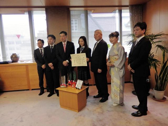 来庁時には、大勢の職員の出迎えを受け、照れくさそうに小走りした本田。山田啓二知事から表彰状を受け取り「素晴らしい賞をいただけて本当にうれしく思っています」とはにかんだ。