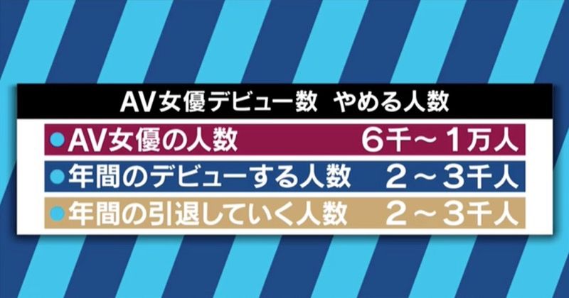 AV業界に詳しい安田理央氏によると、現在6千~1万人ほどのAV女優が活動しており、年に2~3千人がデビュー、 ほぼ同数の2~3千人が引退しているとみられるという。