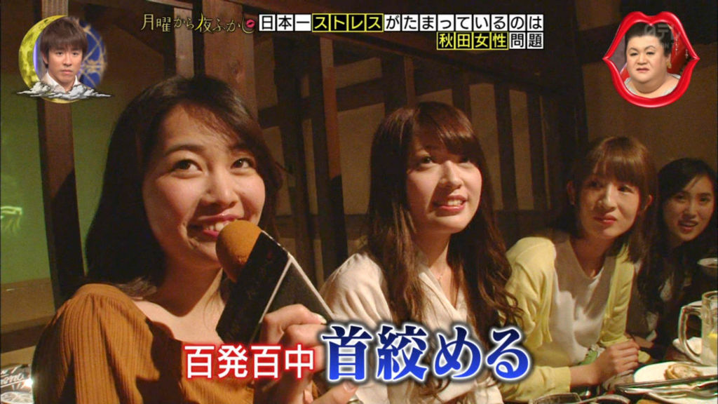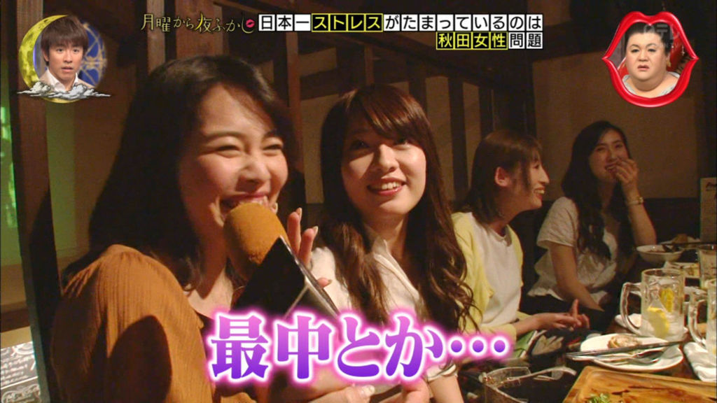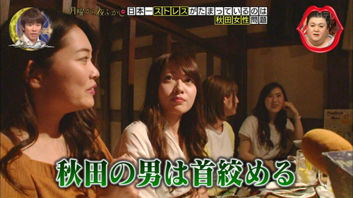 6月18日に放送された『月曜から夜ふかし(日本テレビ系)』にて「秋田のストレス問題」が扱われた。 その中で秋田の女性が合コンしている場面での発言が話題になっている。