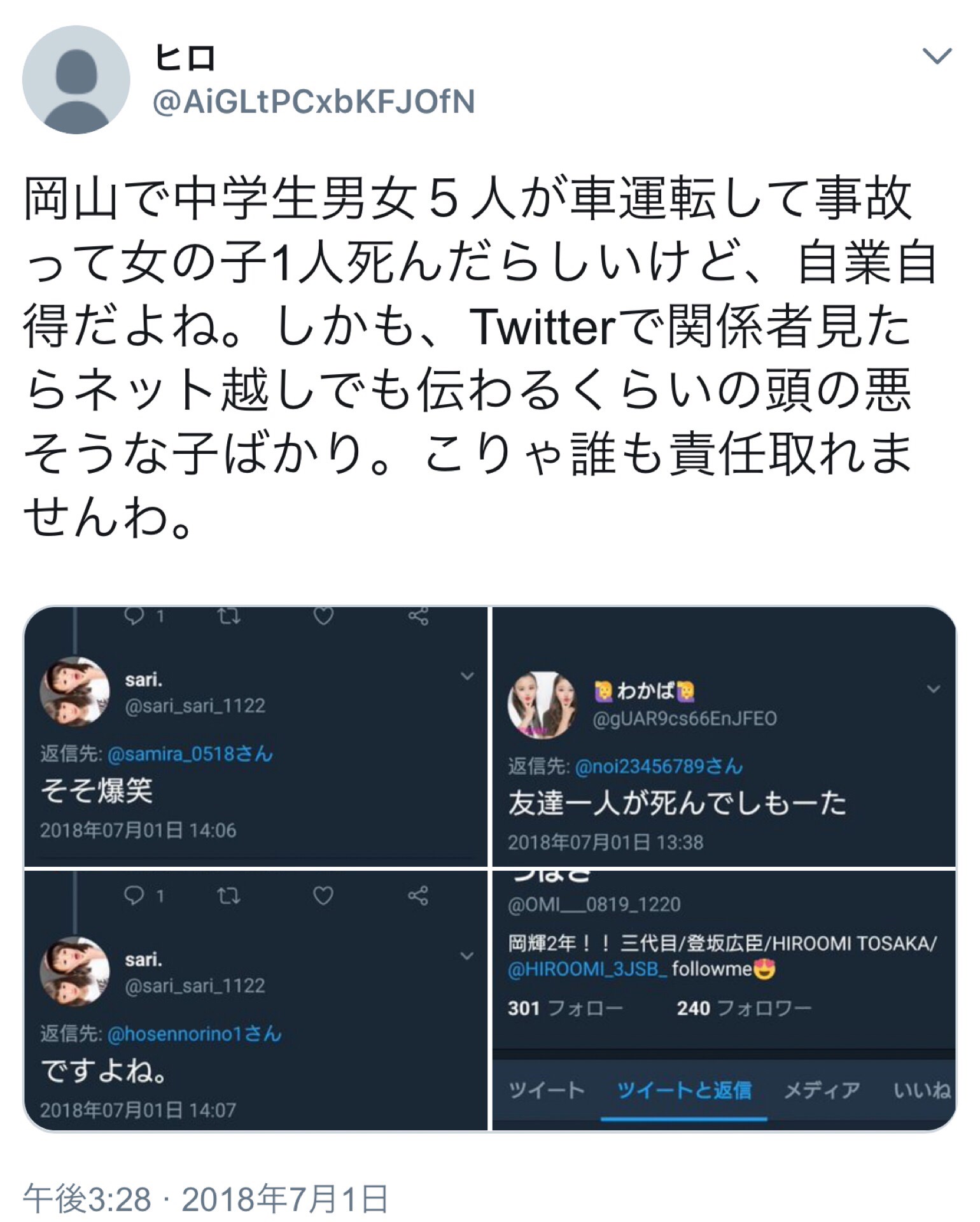 5人は岡山市と倉敷市の中学校に通う友人同士とみられ、乗用車はこのうち1人の家族の所有車だった。現場は片側2車線の見通しの良い直線道路。