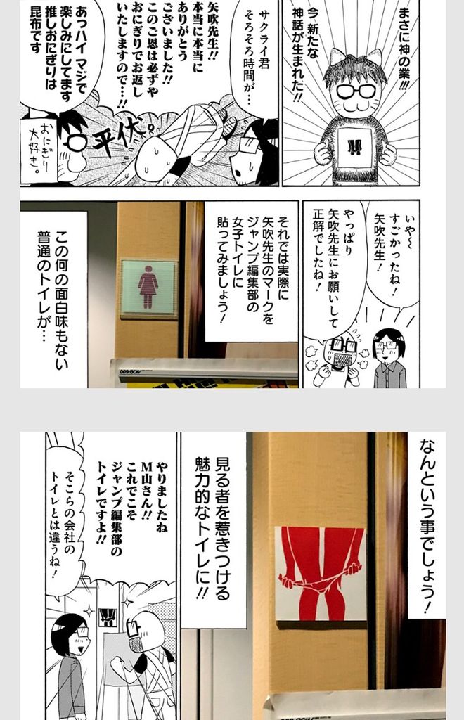 オチでは矢吹さんが手掛けたマークを女子トイレに飾り、「ジャンプ関係者の女子のみなさん!編集部にお越しの際は是非女子トイレにお立ち寄り下さい!」と締めくくっていました。