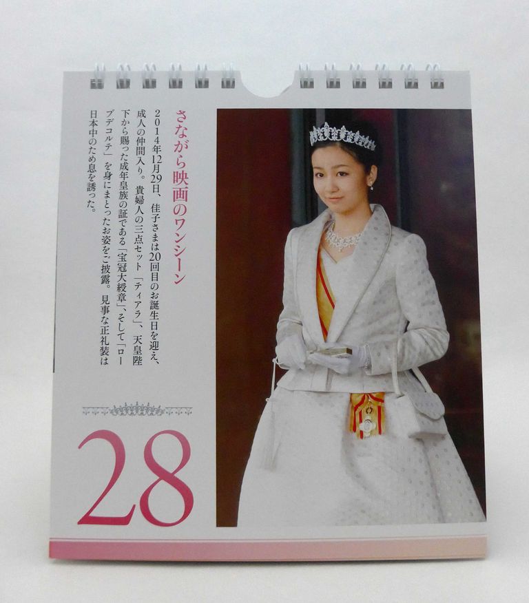 1月に発売されたムック本『麗しの佳子さま 成年皇族のご足跡』でも話題を集めた佳子さまですが、今回はより実用的なカレンダーが登場。