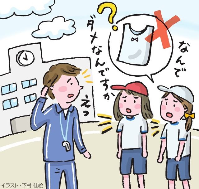 学校側は、肌着を着たまま汗をかくと体が冷えるためだと説明するが、女児の胸など肌が透けて見えることを心配する親も。