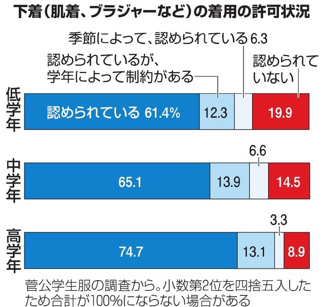 14・4%が「下着(ブラジャーや肌着)の着用が認められていない」と回答。1、2年生に限ると19・9%にのぼった。