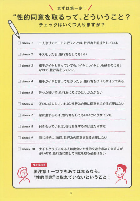 注目してほしい力作は、「相手がイヤと言ってなかったら、性行為もOKのサイン」「付き合っていれば、性行為をするのは当たり前」といった質問が並ぶ10項目のチェックリスト。当てはまれば、性的同意を大切にする傾向が薄い可能性があります。