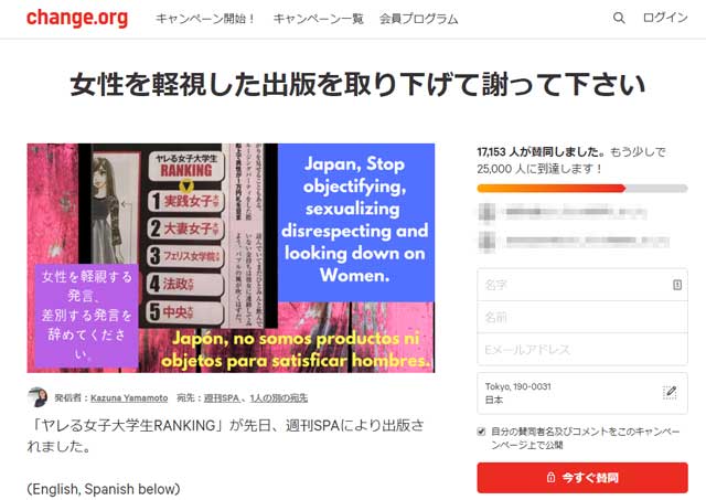 『週刊SPA!』(扶桑社)が2018年12月25日号で掲載した「ヤレる女子大学生RANKING」に反対する署名運動が1月4日に開始されました。