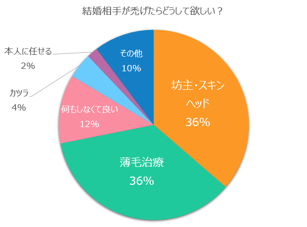 最も多かった回答は「坊主・スキンヘッド」と「病院での薄毛治療」で共に36%という結果。