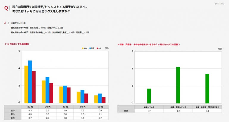 既婚者の1カ月の平均セ◯クス回数は1.7回、未婚で交際相手がいる人の平均は4.2回。