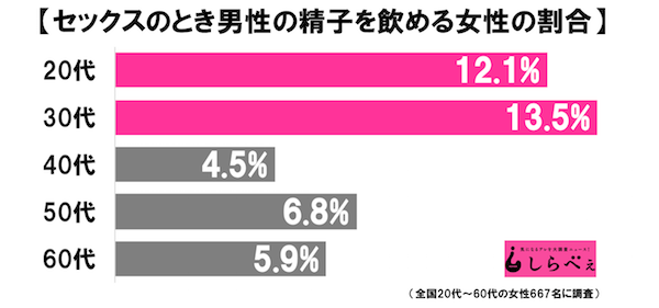 年代別で見ると20代12.1%、30代13.5%とどちらも1割と少しだ。もし男性の精子を飲める女性を見つけたら、それは奇跡に近い。