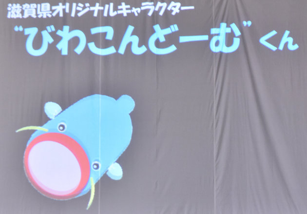 スクリーンに映し出されたコンドーム啓発キャラクター「びわこんどーむ」