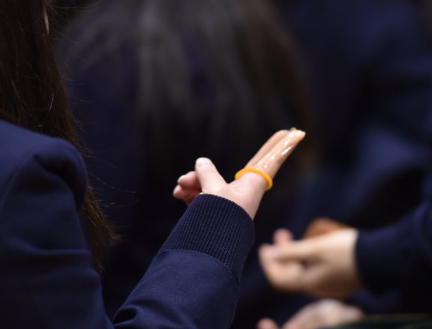 生徒たちはペアになって、コンドームを相手の指にはめる「実習」に挑戦していた。表面に塗られた潤滑剤を確かめて恥ずかしがったり、風船のようにふくらませて大笑いしたり。様々な反応が飛び交う