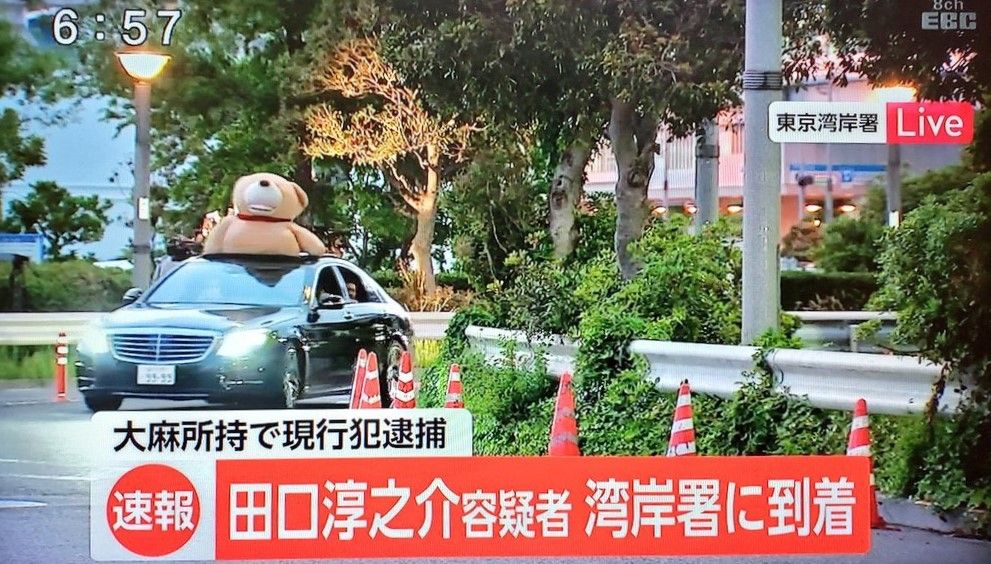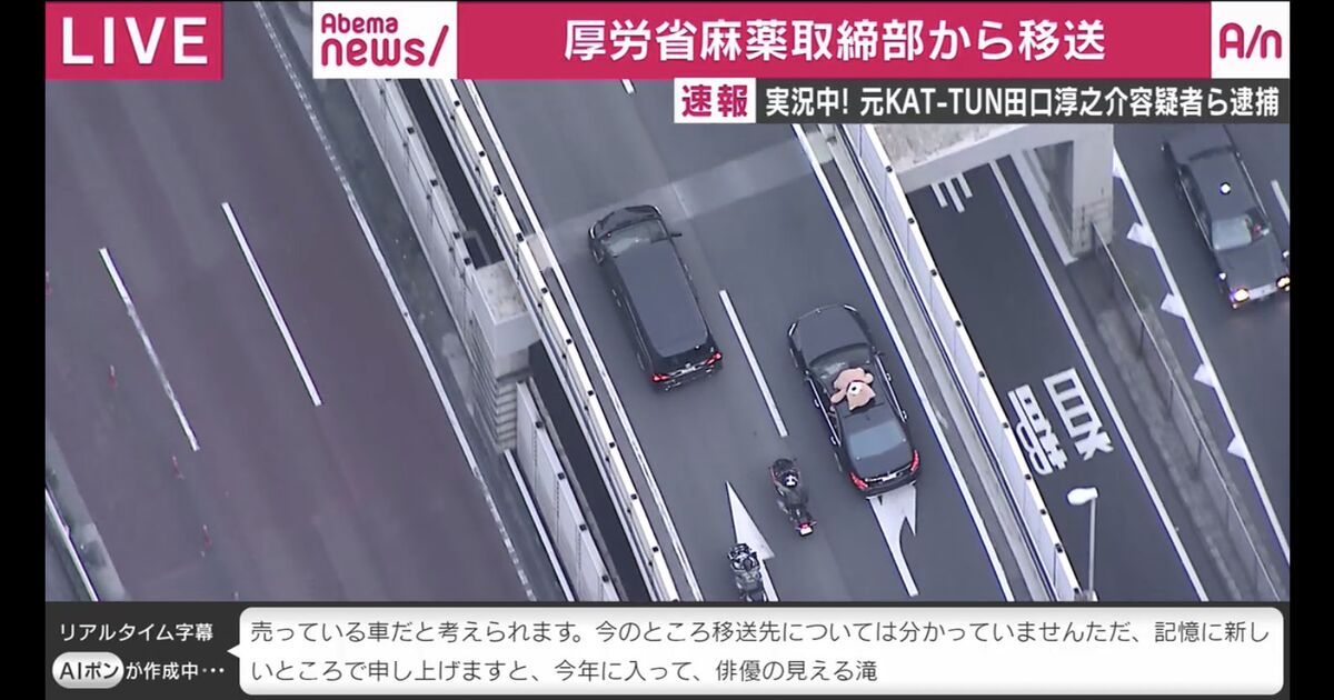 同番組では「厚労省麻薬取締部から移送 速報実況中!元KAT-TUN田口淳之介容疑者ら逮捕」と銘打ち、中継を放送。