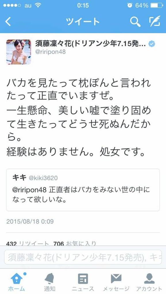 もともと、300人以上の48グループで1番の爆弾娘。ファンからヤジられると、ツイッターで「私は処女です!!」と告白するなど、爆弾発言を連発するタイプだった。