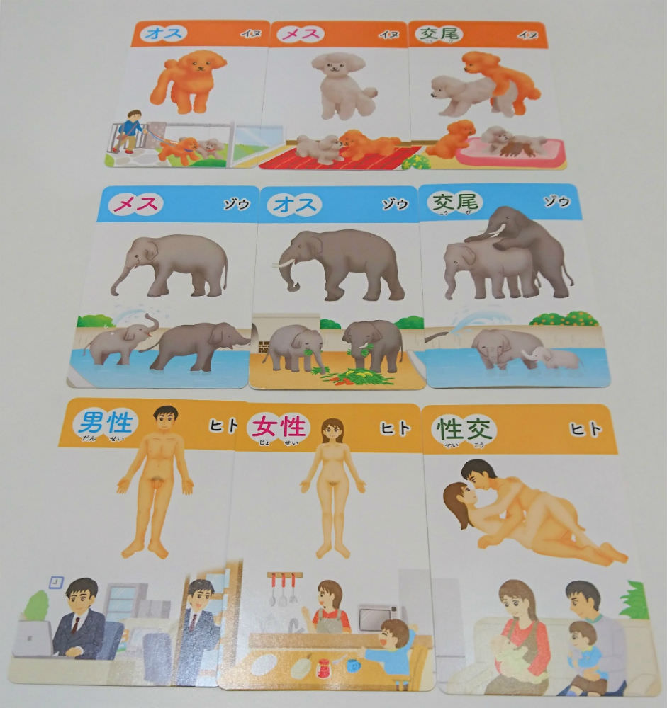 ゲームのカードには、メダカやイルカ、カタツムリ、キリン、ゾウなど17種類の生き物のイラストが描かれ、それぞれ「オス」「メス」「交尾」(人間は「男性」「女性」「性交」)の3種類があります。