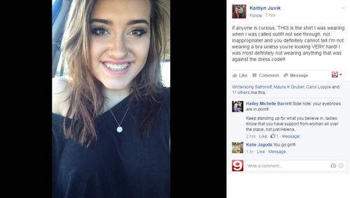 米モンタナ州のヘレナ高校に通うケイトリン・ジュヴィクさん。ある日、彼女がノーブラで登校したところ、 “服装の乱れ” を理由に先生に呼び出されることに。校内で「彼女がノーブラであることに、居心地の 悪さを感じる」との意見があがったので、ブラを付けて登校するようにと指導されたのだ。