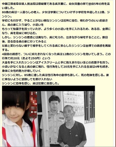 中国江蘇省阜寧県人民法院は容疑者である呉天華に、幼女買春の罪で懲役5年の刑を言い渡した。 80歳の呉は一人暮らしの老人、少女は学業についていけず小学校を中退した12歳、ジンジン。