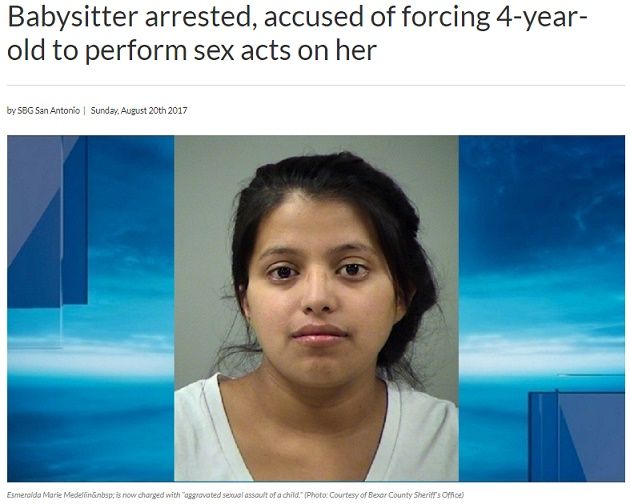 今年3月、ベビーシッターを仰せつかるも幼児にわいせつ行為を働いていたとして今月17日に逮捕されたのは、テキサス州ベア郡サンアントニオのエスメラルダ・マリー・メデリンという18歳の女。4歳男児(子供の将来とプライバシーを考慮し、名前などは明らかにされず)の世話をする契約を結んだメデリンは、その母親が外出して男児と2人だけになると性的行為を強いたことが疑われている。