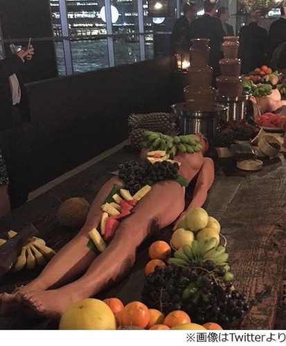 その際、複数の女性がほぼ裸体で横たわり、フルーツなどを身体に乗せる女体盛りの状態で饗応していたという。