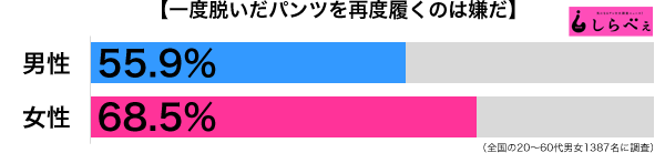 しらべぇ編集部が全国20?60代の男女1,387名に「一度脱いだパンツ」について調査したところ、6割が「再度穿くのは嫌だ」と回答。