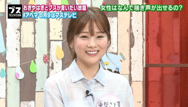 12日、おぎやはぎの小木博明と矢作兼がMCを務めるAbemaTVのトークバラエティ『おぎやはぎの「ブス」テレビ』が放送され、タレントの重盛さと美が「Hの時これだけは自慢できます」というテーマで「声がカワイイと言われます」とぶっちゃけた。