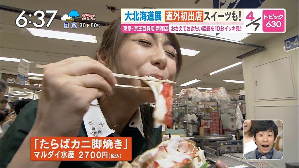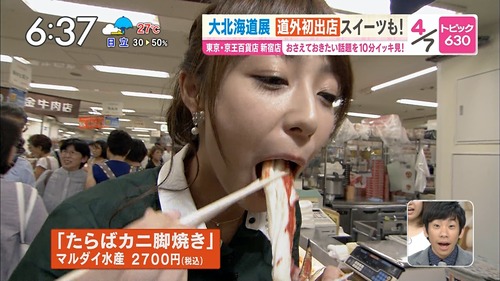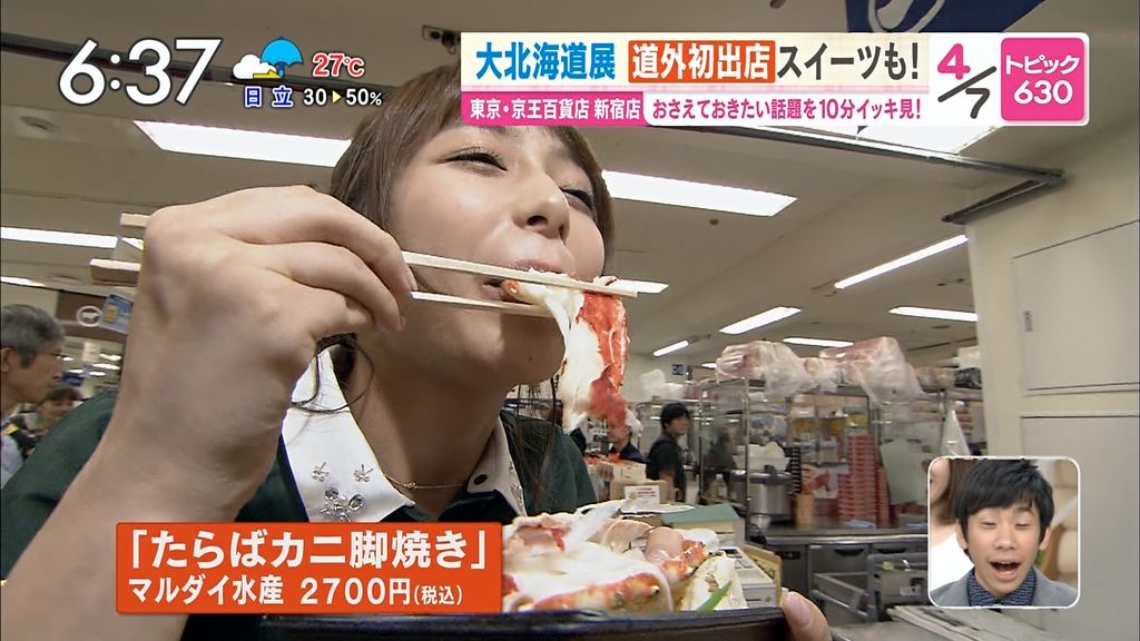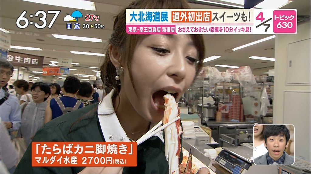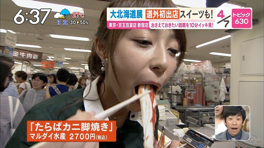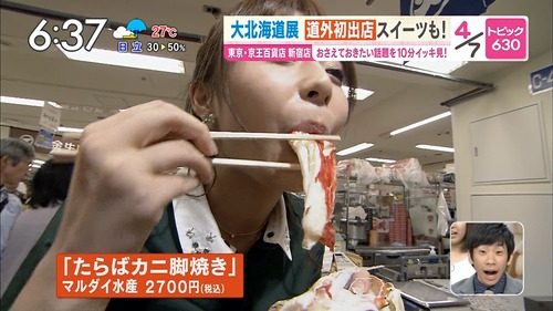 その映像の中で、比較的ピッチリとし、胸のラインがくっきりとわかる濃緑のシャツで登場した宇垣アナは、「たらばカニ脚焼き」(2700円)を実食することに。